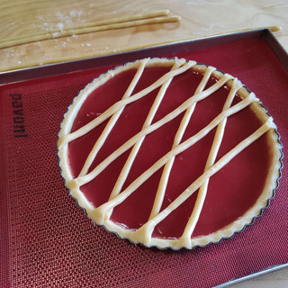 Una volta raffreddate per bene versate sopra il gelo di mellone, con la frolla fate dei rotolini simili a serpentelli e create sopra la crostata la classica griglia